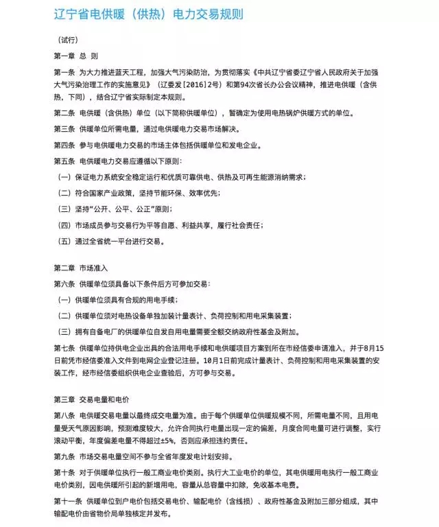 記者了解到,《遼寧省電供暖(供熱)電力交易規(guī)則》是在2016年5月30日印發(fā)的,適用于電力用戶與發(fā)電企業(yè)直接交易,電供暖電力交易參照我省電力用戶與發(fā)電企業(yè)直接交易方式,可采取掛牌、雙邊或集中撮合等交易模式。