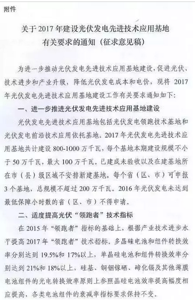■ 國家能源局發(fā)布2017光伏領(lǐng)跑者基地要求 建設(shè)規(guī)模8-10GW每省可申報3個基地