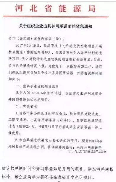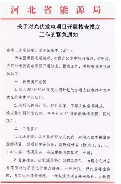 ■ 弄虛作假取消并網(wǎng)指標(biāo) 河北能源局下發(fā)《對光伏發(fā)電項(xiàng)目開展核查摸底工作》的通知