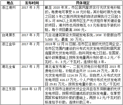 各地關(guān)于光伏補(bǔ)貼的政策文件層出不窮,記者將16年12月至今公開(kāi)的文件進(jìn)行了匯總,通過(guò)整理發(fā)現(xiàn),多數(shù)省份分布式光伏的補(bǔ)貼標(biāo)準(zhǔn)在0.2元—0.3元/kW·h,具體規(guī)定有細(xì)微差別,詳情見(jiàn)下表:
