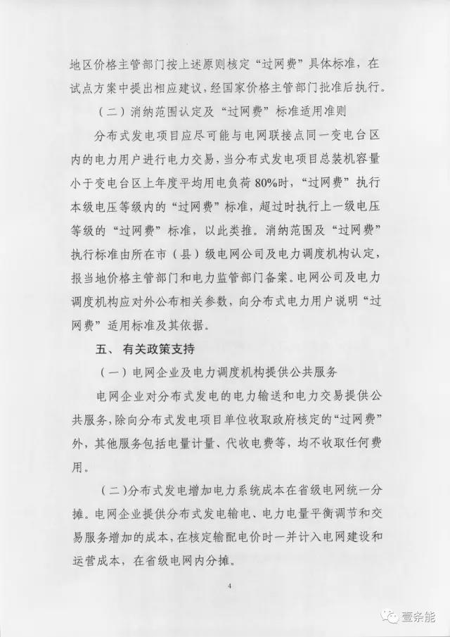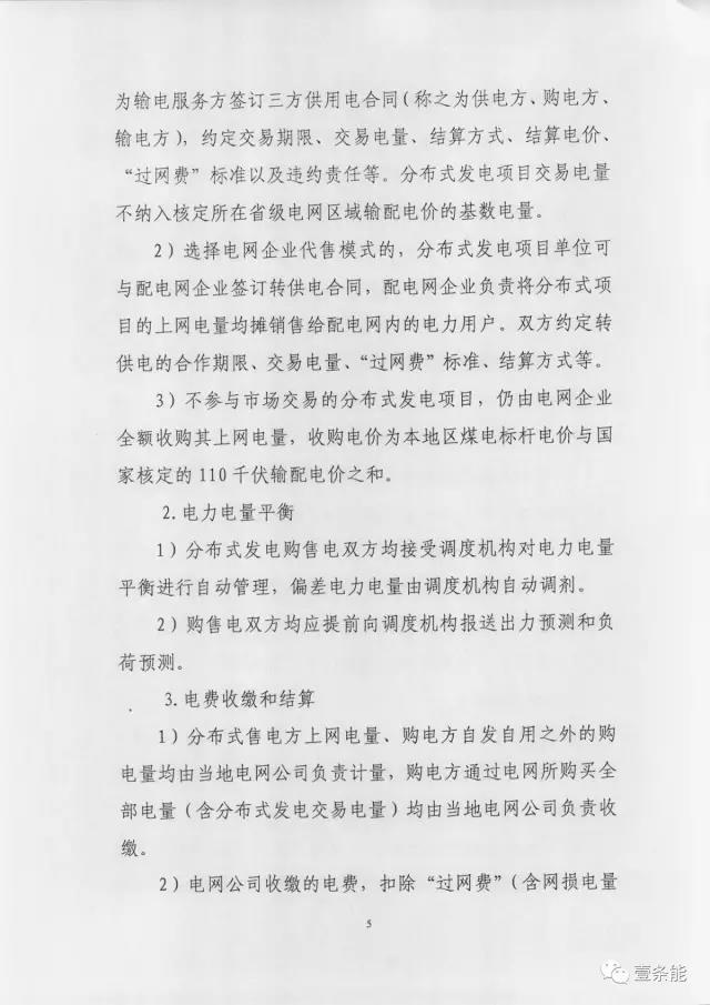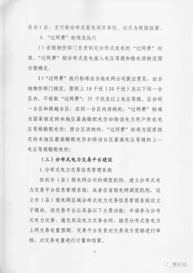 4、過網(wǎng)費(fèi)標(biāo)準(zhǔn):電力用戶(含微電網(wǎng)內(nèi)部)自發(fā)自用及在10(20)千伏電壓等級(jí)且同一變電臺(tái)區(qū)內(nèi)消納,免收過網(wǎng)費(fèi);35-100千伏接入電網(wǎng)且在同一變電臺(tái)區(qū)內(nèi)消納,過網(wǎng)費(fèi)標(biāo)準(zhǔn)為國家核定的本地區(qū)最高輸配電價(jià)扣除改電力用戶所在電壓等級(jí)輸配電價(jià)。