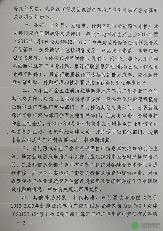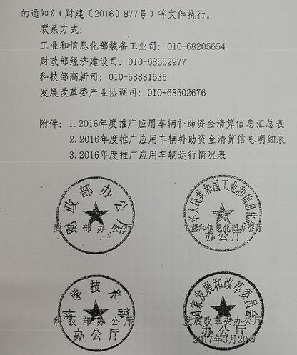另外,該通知要求,省級新能源汽車推廣牽頭部門會同其他相關部門經(jīng)財務審查資料審核和重點抽查后,于2017年4月30日前將申報材料報至工業(yè)和信息化部裝備工業(yè)司、財政部經(jīng)濟建設司,并抄送同級其他部門,逾期未報或報送內(nèi)容不符合要求的,將延期清算。