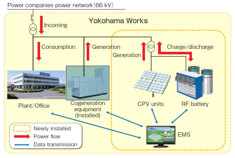 該系統(tǒng)包含有28個(gè)CPV裝置(最大總發(fā)電功率:200kW)*和一個(gè)氧化還原液流電池(容量:1MWx5小時(shí)),其中CPV裝置是產(chǎn)生可再生能源,而氧化還原液流電池則是CPV裝置所產(chǎn)生電力的存儲(chǔ)設(shè)備。通過與外部商業(yè)電網(wǎng)相連,該系統(tǒng)還能也晚間存儲(chǔ)電力公司提供的電力。該系統(tǒng)還配有一個(gè)能源管理系統(tǒng)(EMS),該系統(tǒng)能監(jiān)測CPV裝置的發(fā)電量、電池蓄電量和耗電量,并將監(jiān)測數(shù)據(jù)存儲(chǔ)至中央服務(wù)器內(nèi)。