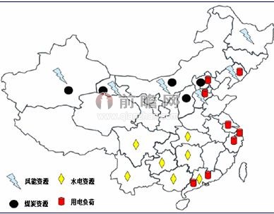 由下圖不難發(fā)現(xiàn),我國的電力資源分布相對集中在華北和西南地區(qū),而用電負(fù)荷相對集中于東南沿海地區(qū)。我國用電負(fù)荷大的地區(qū)與西北、西南清潔能源集中地區(qū)距離較長的特點,使得我國應(yīng)重點發(fā)展長距離、高容量、低損耗的輸電骨干網(wǎng)絡(luò)。
