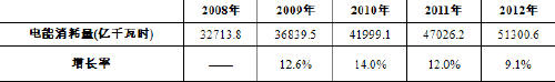 表 1 2008-2012年中國電能消耗量與增長