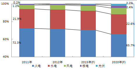 圖 1 2011-2020年中國電能消耗結(jié)構(gòu)及預(yù)測(按發(fā)電量統(tǒng)計)