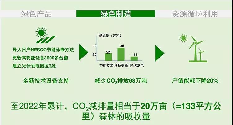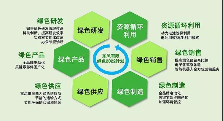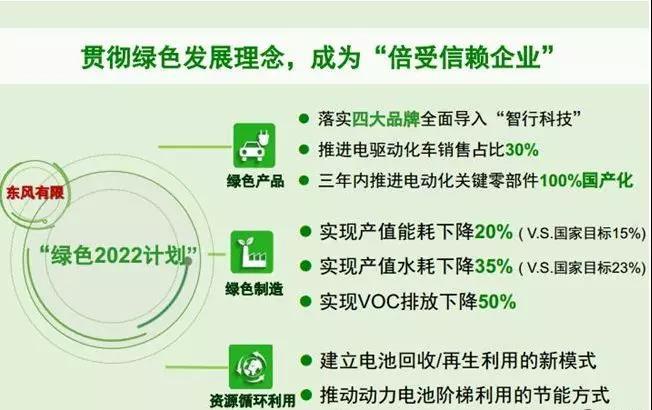 “綠色”和“智能”被東風(fēng)有限看做是發(fā)力未來的關(guān)鍵。 其“綠色2022計(jì)劃”主要涵蓋三大層面,分別為綠色產(chǎn)品、綠色制造以及資源循環(huán)利用。