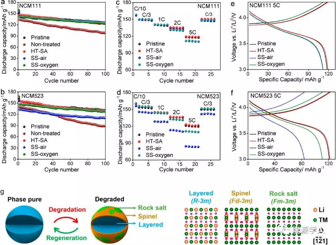 隨后,作者對原始材料、經(jīng)過循環(huán)衰減后的材料、再生后的材料進行循環(huán)性能和倍率性能的電化學(xué)測試。如圖4所示,衰減后的NCM材料循環(huán)性能很差,水熱燒結(jié)法和在氧氣中進行直接燒結(jié)法再生后的材料都可以完全恢復(fù)其原始材料的循環(huán)性能,而水熱燒結(jié)法再生材料具有更好的倍率性能。對于鎳含量較高的NCM523正極,在空氣中直接燒結(jié)再生并不能恢復(fù)其循環(huán)性能,與其表面存在的巖鹽相有關(guān)。