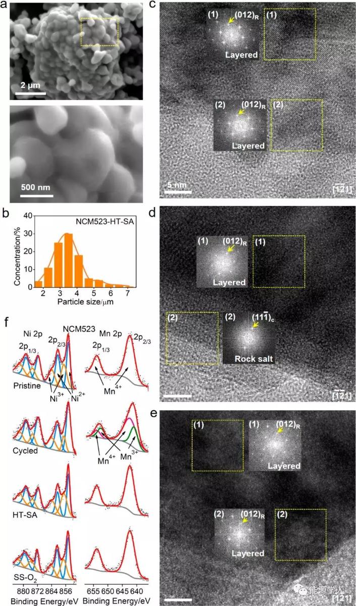 圖3. (a) 再生NCM523顆粒的SEM圖像,(b) 再生NCM523二次顆粒的尺寸分布,(c) 經(jīng)過水熱和燒結(jié)法再生的NCM523顆粒的HR-TEM圖像 (d) 經(jīng)過在空氣中直接燒結(jié)法再生的NCM523顆粒的HR-TEM圖像,(e) 經(jīng)過在氧氣中直接燒結(jié)法再生的NCM523顆粒的HR-TEM圖像,(f) 原始、循環(huán)后、再生后的NCM523的XPS譜圖。
