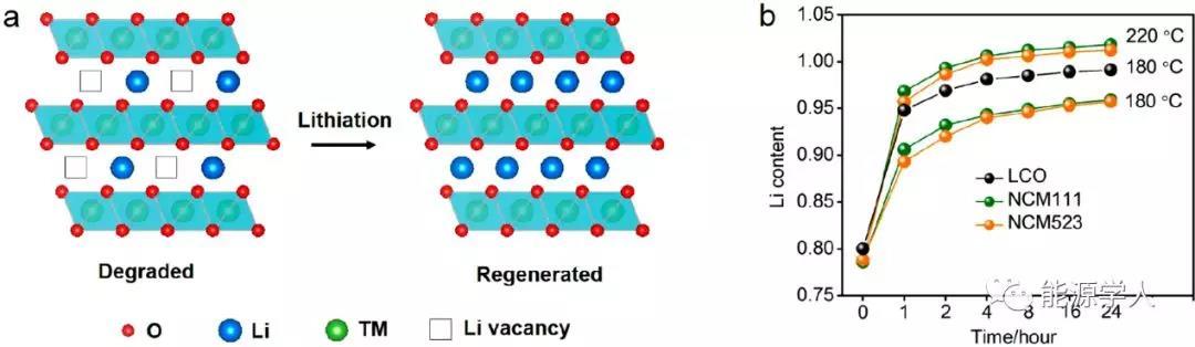 圖2.(a)向正極材料補充鋰的示意圖,(b)隨著水熱時間變化正極材料中鋰的含量