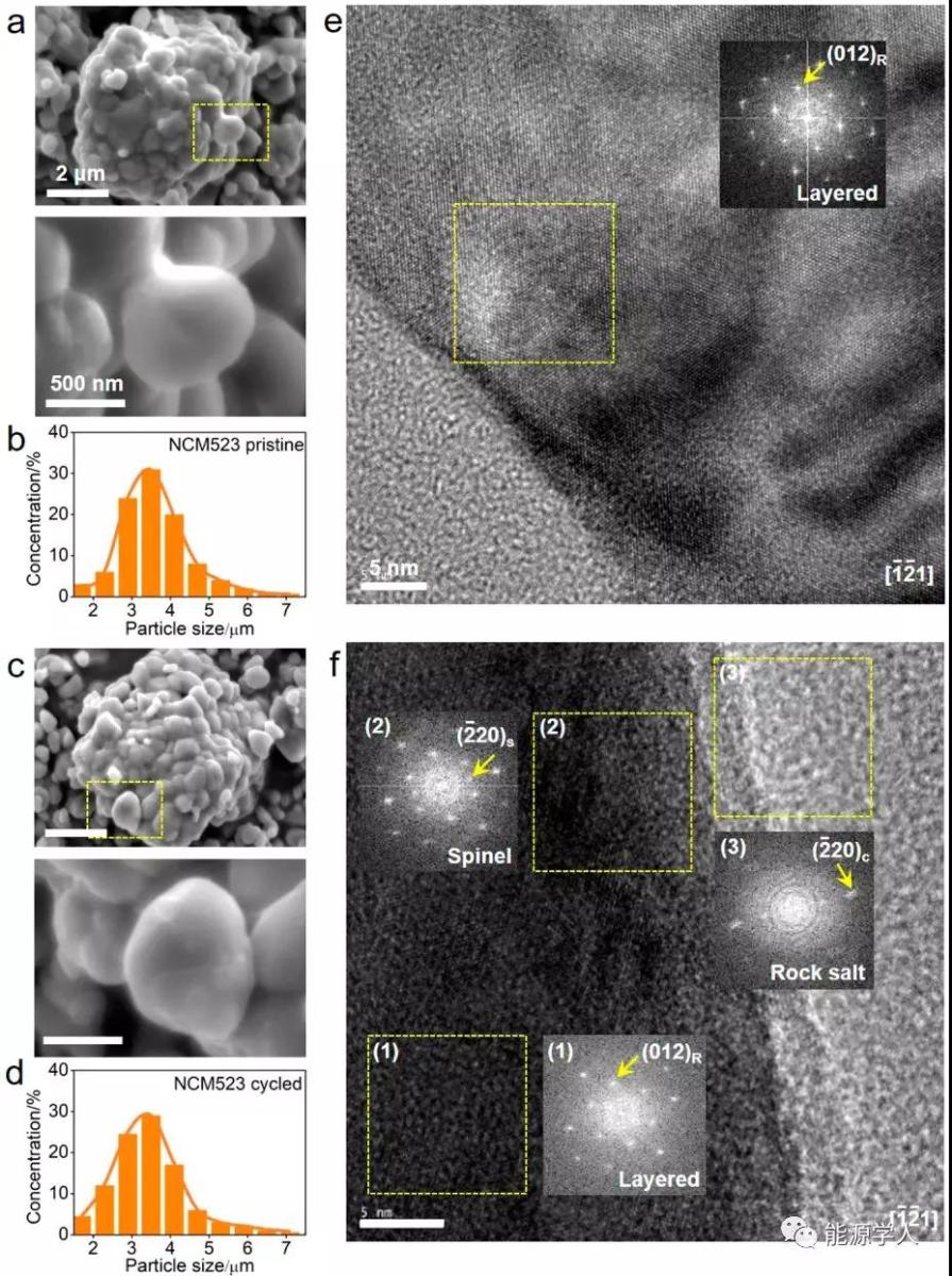 圖1. (a) 原始NCM523顆粒的SEM圖像,(b) 原始NCM523二次顆粒的尺寸分布,(c) 循環(huán)后NCM523顆粒的SEM圖像,(d) 循環(huán)后NCM523 二次顆粒的尺寸分布,(e) 原始NCM523顆粒的HR-TEM圖像,(f) 循環(huán)后NCM523顆粒的HR-TEM圖像。