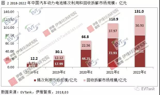 從市場(chǎng)規(guī)模來(lái)看,EVTank通過(guò)經(jīng)濟(jì)模型測(cè)算認(rèn)為,到2020年中國(guó)動(dòng)力電池回收拆解和梯次利用的總體市場(chǎng)規(guī)模將達(dá)到66.8億元,到2022年整體市場(chǎng)規(guī)模將達(dá)到131.0億元。通過(guò)對(duì)梯次利用和回收拆解的市場(chǎng)規(guī)模對(duì)比分析,EVTank認(rèn)為梯次利用的市場(chǎng)規(guī)模遠(yuǎn)大于回收拆解。