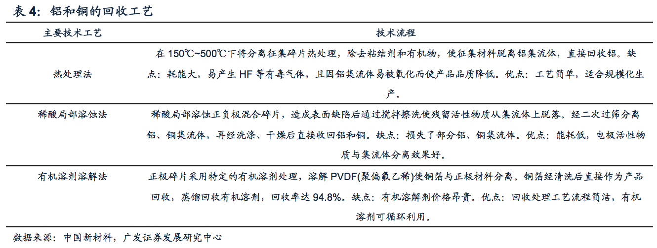 拆解回收方面,部分回收再生利用技術(shù)相對梯次利用已較為成熟,可實現(xiàn)較高的整體元素回收率,部分元素回收率可接近100%。目前國內(nèi)一些企業(yè)已裝配全自動化鋰動力電池拆解回收線,可對鋰動力電池中銅鋁金屬回收率高達98%,正極材料回收率超過90%。拆解回收主要受制于上游電池來源和環(huán)保監(jiān)管環(huán)境,目前國內(nèi)仍處于起步階段。