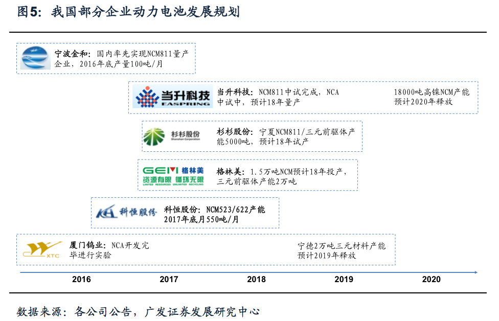 三元代表未來,高鎳趨勢明確。新能源的動力應用需求的出現(xiàn),從安全性、壽命、能量密度與成本等方面對電池發(fā)展提出新要求。其中通過對影響最大的正極材料性能對比,我們發(fā)現(xiàn),三元的能量密度最高,綜合性能最好。從供應量反面來看,三元電池供應占比從2016年的平均30%上升到2017年的70%以上,未來趨勢會進一步集中。隨著多項動力電池能力密度規(guī)劃出臺,新版補貼與能量密度直接掛鉤,在政策指引以及下游需求傳導共同影響下,動力電池行業(yè)未來向高密度發(fā)展趨勢明朗。而高鎳化可顯著提升三元電池能量密度,目前多家廠家均開展高鎳三元布局。