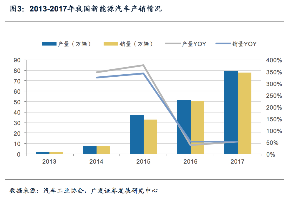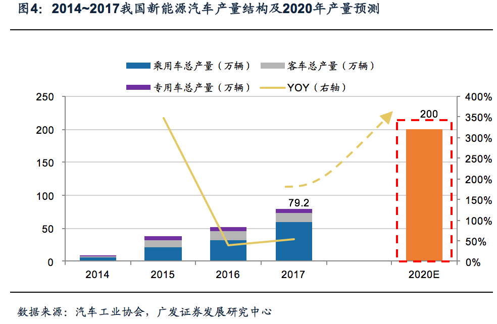 從數(shù)量方面來看,2017年我國新能源汽車生產(chǎn)79.4萬輛,全年銷售77.7萬輛,較去年同期水平分別增長53.5%和53.3%,保持了強勁的增長勢頭。與2018年銷售0.24萬輛新能源汽車相比,2017年銷量是2008年銷量的約324倍,CAGR高達78.25%。預計2020年我國新能源汽車銷量高達200萬輛。