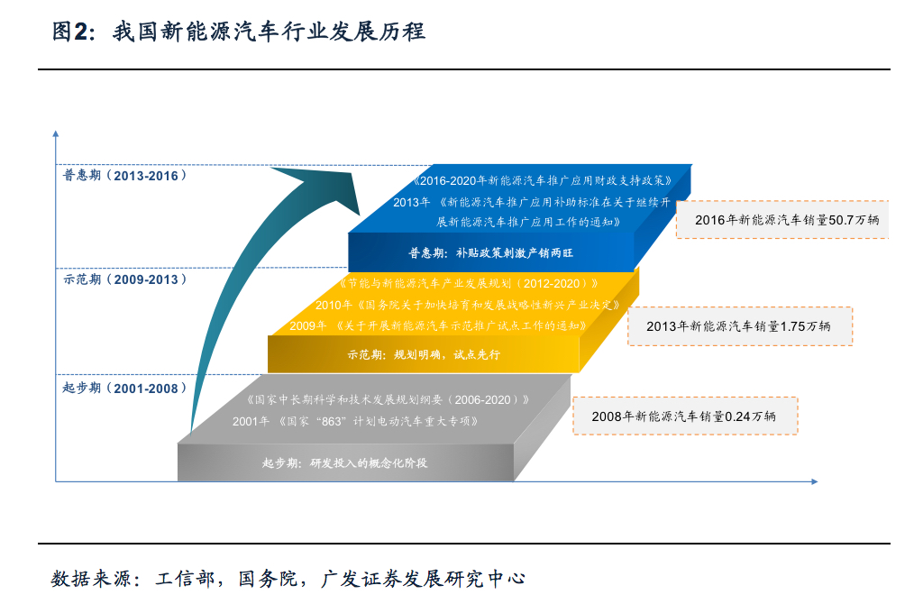 我國新能源汽車行業(yè)的迅猛發(fā)展得益于國家從“十五”以來實施的各項產(chǎn)業(yè)發(fā)展政策。從2001年到現(xiàn)在,我國新能源汽車產(chǎn)業(yè)政策走過了啟動期(2001-2008)、示范推廣期(2009-2013)、普惠期(2013-2016)以及放量期(2017-)四個發(fā)展階段。從啟動期的研發(fā)投入概念化極端,到示范期規(guī)劃明確試點先行,再至普惠期補貼政策刺激產(chǎn)銷兩旺,新能源汽車行業(yè)整體發(fā)展趨勢確定,市場起底不息。