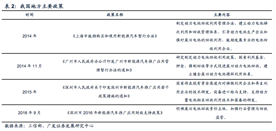 此次七部委印發(fā)《新能源動力蓄電池回收利用管理暫行辦法》,將動力電池回收利用提升到了前所未有的高度,并明確汽車生產(chǎn)企業(yè)應建立動力蓄電池回收渠道,負責回收新能源汽車使用及報廢后產(chǎn)生的廢舊動力蓄電池,同時動力電池企業(yè)要在電池設(shè)計、生產(chǎn)及回收方面提供支持。隨著新能源汽車產(chǎn)銷量持續(xù)增長,動力鋰電池回收利用后市場問題也越來越突出,國家和地方相繼出臺政策,預計18年將加快建設(shè)良性產(chǎn)業(yè)生態(tài)系統(tǒng)的進程。