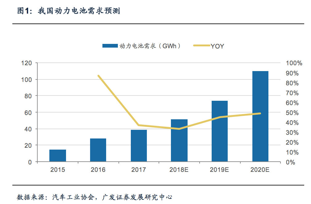 隨著新能源汽車的持續(xù)放量,動力電池保有量也水漲船高。2017年動力電池裝機量約38.3GWh,同比增長36.8%。未來幾年快速增長態(tài)勢有望延續(xù),預計2020年新能源汽車動力電池需求將達到約110GWh,其中新增需求90Gwh,存量更換需求20GWh。