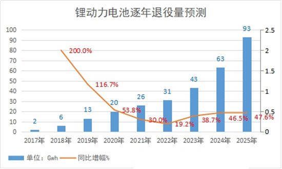專業(yè)研究機(jī)構(gòu)發(fā)布報(bào)告稱,2020 年我國(guó)將有約 20Gwh 的動(dòng)力電池退役,2025 年將有大約 93Gwh 的動(dòng)力電池退役。由此帶來(lái)的電池回收利用規(guī)模在 2020 年將達(dá)到 107 億元左右。到 2025 年市場(chǎng)規(guī)模將達(dá)到 379 億元。由此可見(jiàn),動(dòng)力電池的回收利用將快速形成一個(gè)巨大的新興市場(chǎng)。
