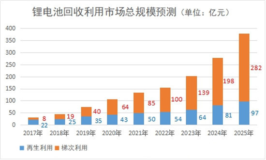 從2018年開(kāi)始,國(guó)內(nèi)首批進(jìn)入市場(chǎng)的汽車動(dòng)力電池即將迎來(lái)“報(bào)廢潮”。專業(yè)機(jī)構(gòu)預(yù)測(cè),市場(chǎng)總規(guī)模在2020年將超過(guò)100億元,到2025年將達(dá)到380億元,新能源汽車退役動(dòng)力電池的回收利用將成為重要的新興領(lǐng)域。