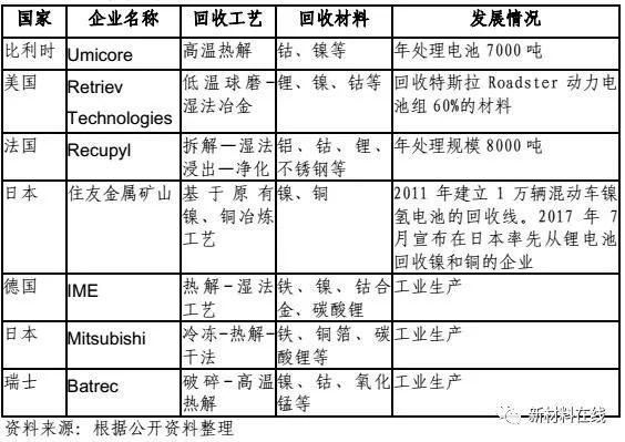 此前,歐美和日本的消費(fèi)電池、家電電子等回收利用(主要方式是再生利用)取得了良性的發(fā)展,為動(dòng)力電池的再生利用打下了良好基礎(chǔ)。從動(dòng)力再生利用的實(shí)施主體上看,大多為專業(yè)的金屬冶煉回收企業(yè)或材料企業(yè)轉(zhuǎn)型而來。比利時(shí)優(yōu)美科、美國 Retriev Technologies、法國 Recupyl、日本住友金屬礦山等是全球較為知名的鋰電池再生企業(yè)。
