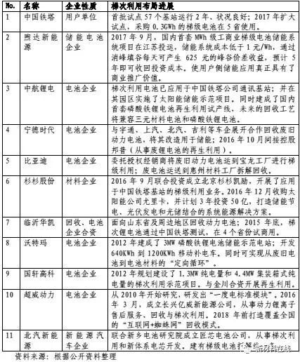 在巨大的市場潛力和企業(yè)自身責(zé)任面前,鋰電池產(chǎn)業(yè)鏈的各相關(guān)主體都在積極布局動(dòng)力電池回收利用。其中梯級利用領(lǐng)域由于與電池關(guān)聯(lián)度最高,因此動(dòng)力電池企業(yè)布局最多;車企總體對此重視度不足(北汽新能源除外)。此外,電池材料企業(yè)杉杉股份著眼于構(gòu)建“儲(chǔ)能節(jié)電、光伏發(fā)電和光儲(chǔ)結(jié)合的系統(tǒng)能源解決方案”的雄心,聯(lián)合相關(guān)企業(yè)進(jìn)行投資布局,也取得了初步進(jìn)展。各主要企業(yè)的梯級利用布局情況如表 3 所示(企業(yè)詳細(xì)情況見附件 2)。