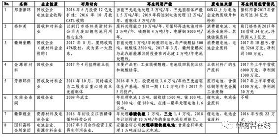 湖南金源新材料股份有限公司于 2003 年在益陽市注冊成立,2017 年 4 月掛牌新三板(871370)。主要從事廢舊鋰電池與鎢鈷廢料等再生利用,該公司的廢料來源主要來自正極材料廠的生產(chǎn)廢料,主要產(chǎn)品有:工業(yè)級碳酸鋰、電池級四氧化三鈷和硫酸鈷等。2017 年上半年?duì)I業(yè)收入 6000 萬元,凈利潤超過 1300 萬元。