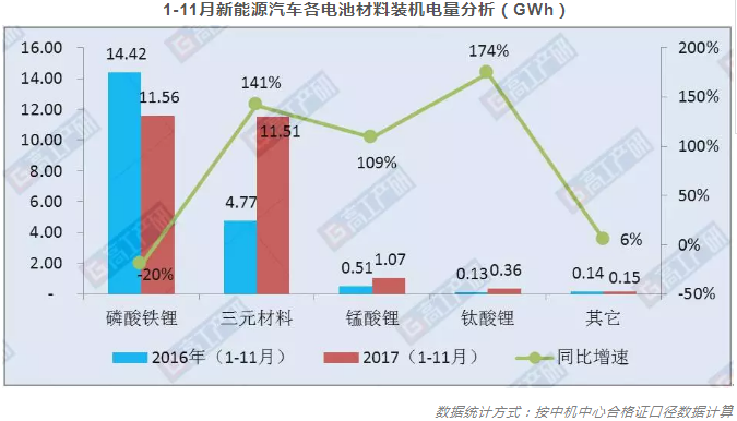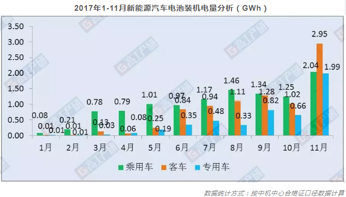 高工產(chǎn)業(yè)研究院(GGII)數(shù)據(jù)統(tǒng)計(jì)顯示,2017年11月新能源汽車(chē)動(dòng)力電池裝機(jī)總電量約6.98GWh,同比增長(zhǎng)20%,環(huán)比增長(zhǎng)138%。1-11月動(dòng)力電池裝機(jī)總電量約24.65GWh,同比增長(zhǎng)23%。