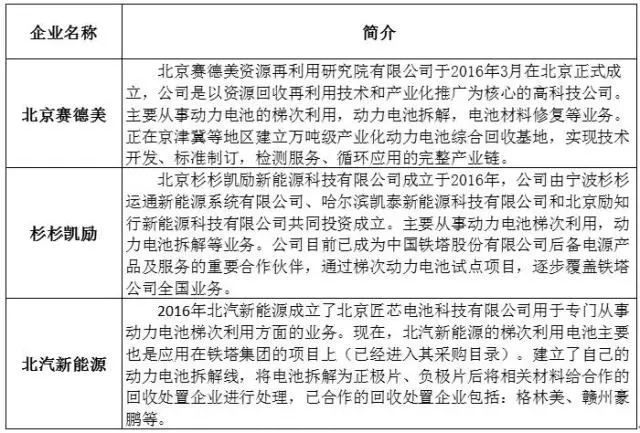 面對(duì)如此巨大的市場(chǎng)前景,企業(yè)紛紛布局動(dòng)力電池梯次利用市場(chǎng),其中參與鐵塔集團(tuán)梯次利用儲(chǔ)能試點(diǎn)項(xiàng)目的企業(yè)就包括:北京賽德美、杉杉凱勵(lì)、北汽新能源等企業(yè)。