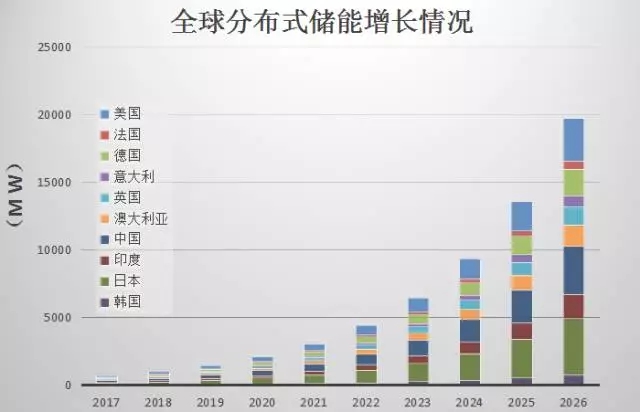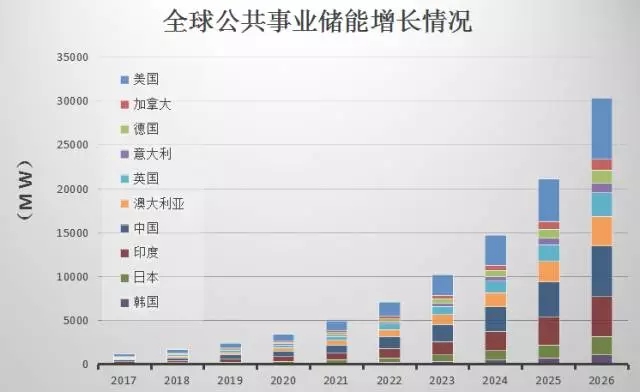 從增長數據方面來看,2017年全球增量最多的5個國家分別是美國、中國、印度、英國和澳大利亞。這個5個國家占據了全球儲能增量的51%。在公用事業(yè)規(guī)模及分布式領域中,儲能高度集中部署在政策有利條件的國家。2017年,前5大國家將占新增分布式儲能容量的70%,占新增公用事業(yè)規(guī)模儲能容量的57%。