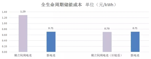 但是,動力電池的梯次利用依然面臨較大的問題,其中最大的問題在于成本。以一個3MW*3h的儲能系統(tǒng)為例,在考慮投資成本、運營費用、充電成本、財務費用等因素之后,如采用梯次利用的動力電池作為儲能系統(tǒng)電池則系統(tǒng)的全生命周期成本在1.29元/kWh。而采用新生產的鋰電池作為儲能系統(tǒng)的電池,則系統(tǒng)的全生命周期成本在0.71元/kWh。由此可見,梯次利用動力電池成本明顯高于新電池。其主要的原因在于梯次利用技術現階段尚不成熟,從而導致在退役動力電池的拆解、可用模塊的檢測、挑選、重組等方面的成本較高。同時,由于梯次利用的電池一致性較差,需要在采購相關設備的時候增加一部分成本用于采購加強系統(tǒng)穩(wěn)定性的設備。這些成本都是制約梯次動力電池在儲能產業(yè)推廣發(fā)展的重要因素。若政府對梯次電池儲能系統(tǒng)進行1200元/kWh進行補貼,則系統(tǒng)的全生命周期成本將降至0.70元/kWh。