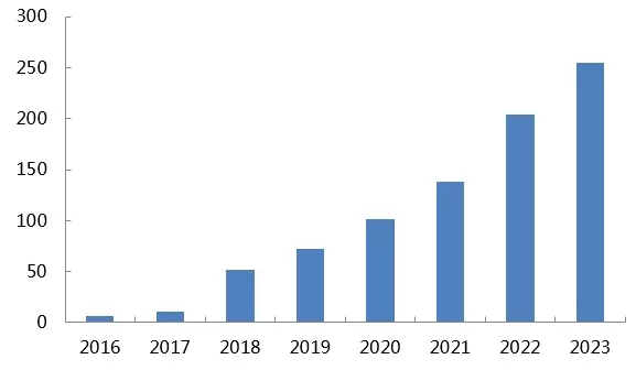 2016-2023年動(dòng)力鋰電池回收市場(chǎng)規(guī)模(億元)