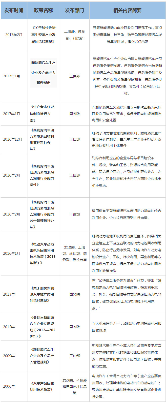 隨著動(dòng)力電池回收問(wèn)題日益顯現(xiàn),國(guó)家的相關(guān)政策開(kāi)始落實(shí),只2017年國(guó)家就連續(xù)發(fā)布了3個(gè)相關(guān)政策,督促電池回收發(fā)展。前不久,三部委下發(fā)《關(guān)于加快推進(jìn)再生資源產(chǎn)業(yè)發(fā)展的指導(dǎo)意見(jiàn)》,將在京津冀、長(zhǎng)三角、珠三角等新能源汽車發(fā)展集聚區(qū)域,建立試點(diǎn)示范;1月份,工信部頒布《新能源汽車生產(chǎn)企業(yè)及產(chǎn)品準(zhǔn)入管理規(guī)定》明確了新能源汽車產(chǎn)品售后服務(wù)承諾制度,其中特別標(biāo)注了電池回收;同月,國(guó)務(wù)院頒布《生產(chǎn)者責(zé)任延伸制度推行方案》,明確了“誰(shuí)生產(chǎn),誰(shuí)負(fù)責(zé)”的原則。