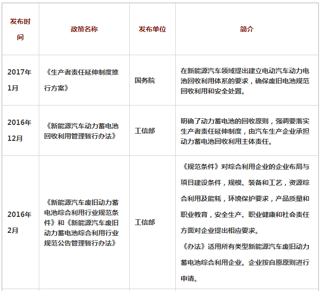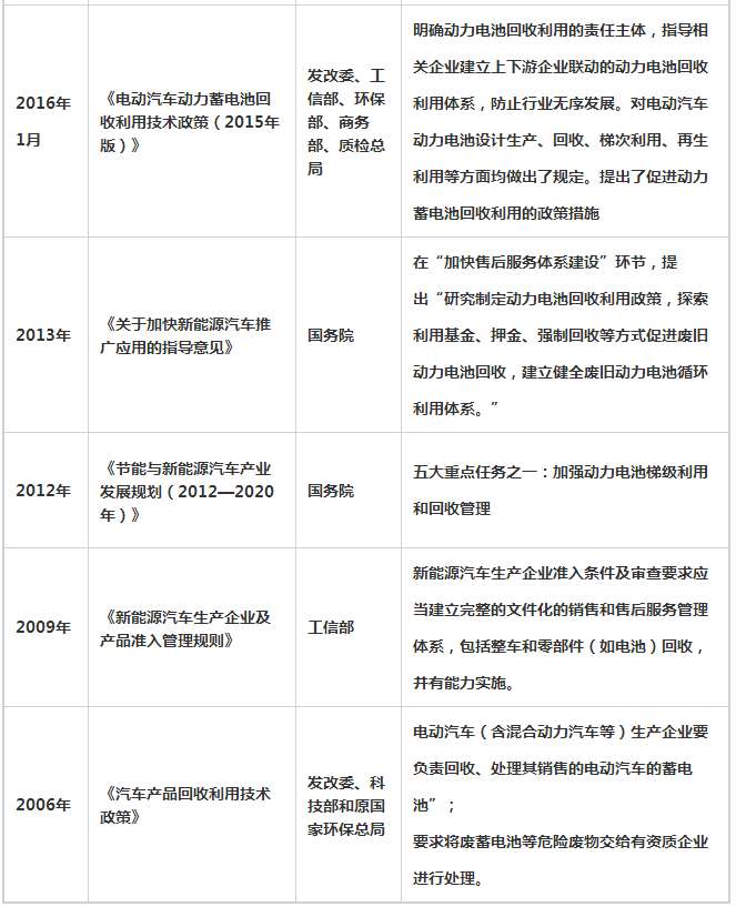 隨著近年來中國新能源汽車推廣使用數(shù)量的快速上升,部分動力電池開始進入報廢期。政府高度重視動力電池回收利用,已經(jīng)開始研究制定相關(guān)政策和標(biāo)準(zhǔn)。日前,工信部發(fā)布了《新能源汽車動力蓄電池回收利用管理暫行辦法》,此后,國務(wù)院辦公廳又印發(fā)《生產(chǎn)者責(zé)任延伸制度推行方案》(以下簡稱《方案》),倡導(dǎo)綠色制造,保護生態(tài)環(huán)境,其中對汽車生產(chǎn)和動力電池回收提出具體要求。盤點歷年政策,要求愈發(fā)具體,為產(chǎn)業(yè)發(fā)展指明了方向。