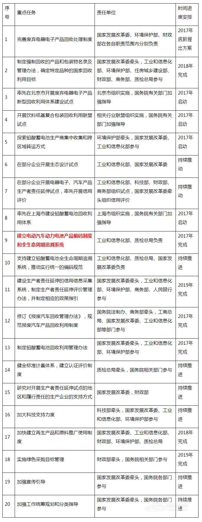 “建立電動汽車動力電池產(chǎn)品編碼制度和全生命周期追溯系統(tǒng)”被列為重點任務(wù),該項任務(wù)由工業(yè)和信息化部、質(zhì)檢總局負責(zé),計劃于2017年完成。