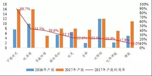 2016-2017年中國(guó)主要電池企業(yè)產(chǎn)能(GWh)及產(chǎn)能利用率