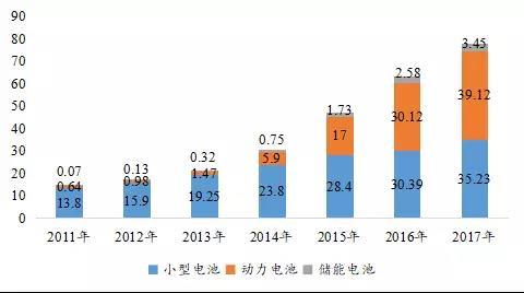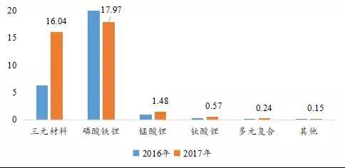 2011-2017年中國(guó)不同類型鋰電池出貨量(單位:GWh)