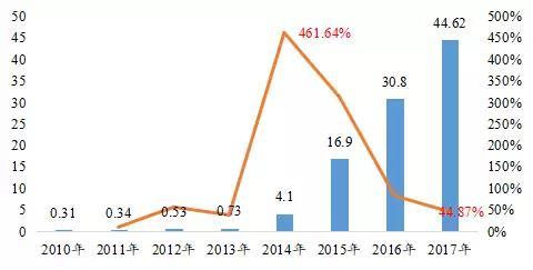 2010-2017年中國(guó)動(dòng)力鋰電池產(chǎn)量(GWh)及同比增速
