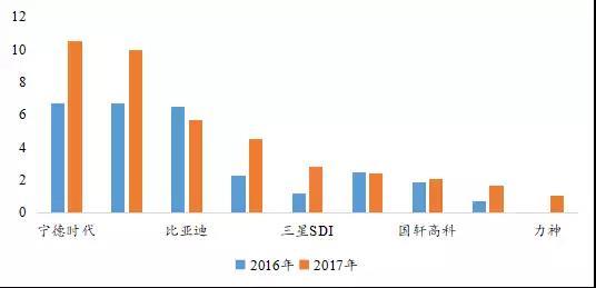 2016-2017年全球主要?jiǎng)恿﹄姵仄髽I(yè)出貨量(單位:GWh)