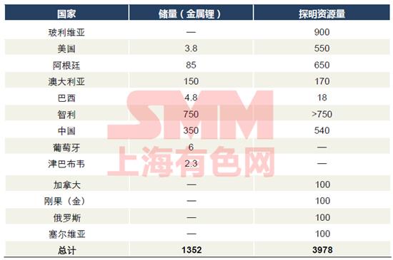 根據(jù)美國(guó)地質(zhì)調(diào)查局公布的數(shù)據(jù),世界鋰資源儲(chǔ)量(金屬鋰)總計(jì)為1,352萬(wàn)噸,探明資源量為3,978萬(wàn)噸。其中世界探明資源量排名前十一位為玻利維亞、智利、阿根廷、美國(guó)、中國(guó)、澳大利亞、加拿大、剛果(金)、俄羅斯、塞爾維亞和巴西。