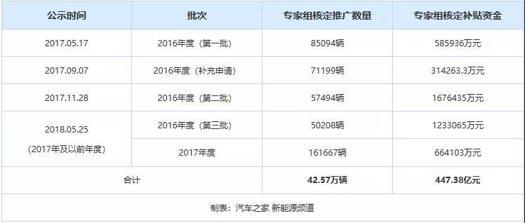 這是2018年工信部的第一輪新能源汽車補(bǔ)貼款的審核公示。在2017年,該部門(mén)總共分三批,有21.38萬(wàn)輛汽車獲批得到257.67億元補(bǔ)貼款。