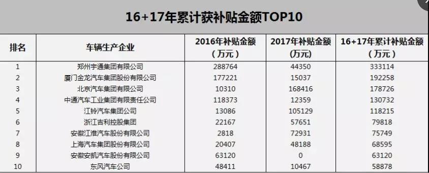 有意思的是,2017年的新能源汽車銷量冠軍比亞迪,在這一波操作中,只收獲了2016年的新能源補(bǔ)貼,2017年金額尚未呈現(xiàn)出來(lái)。因而也沒(méi)有殺進(jìn)補(bǔ)貼排行榜。
