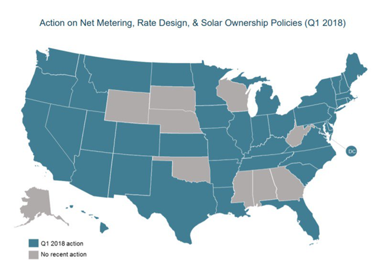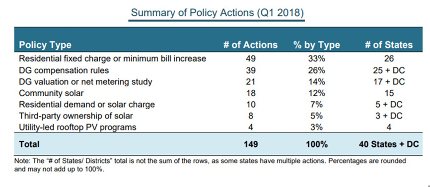 NCCETC新的報告顯示,2018年第一季度的149項政策行動在40個州實施。許多人都對公用事業(yè)的應(yīng)對措施感到擔(dān)憂,59家公用事業(yè)公司要求增加所有住宅太陽能客戶的月度固定費用或最低費用。