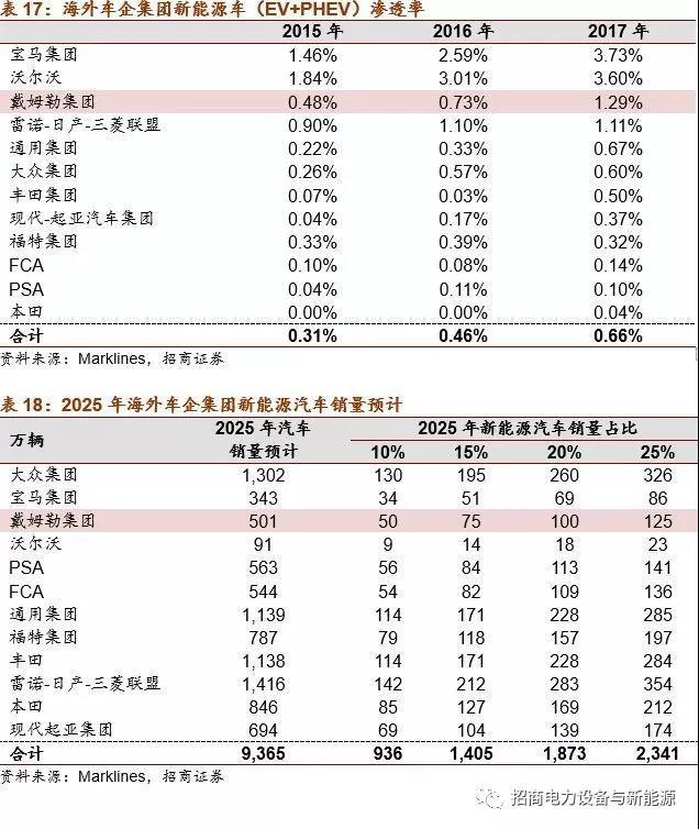 2025年海外車企新能源車當(dāng)年銷量預(yù)計達1400萬輛以上。2012-2017年,海外12大車企集團(不包含特斯拉)所有整車銷量CAGR約2.6%。假設(shè)該復(fù)合增速為2017-2025年的增速,對應(yīng)2025年銷量為9365萬輛。我們分別假設(shè)2025年12大車企集團新能源汽車(EV+PHEV)滲透率為10%、15%、20%、25%,分別對應(yīng)936、1405、1873、2341萬輛的當(dāng)年銷量。中性預(yù)測2025年海外12大車企的新能源汽車銷量有望達到1400-1900萬輛。