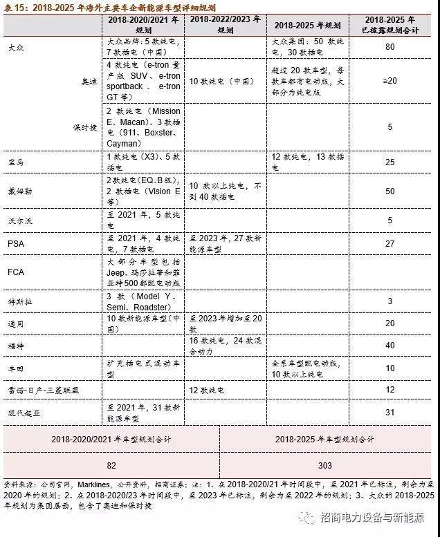 海外車企即將進入密集推車期。根據(jù)各車企未來新能源汽車戰(zhàn)略規(guī)劃,海外13大車企集團在2018-2020/2021年期間,將推出的新能源車型數(shù)量將大于82款,年均21款以上;在2018-2025年期間,將推出的新能源車型總數(shù)將大于303款,年均38款以上;而過去3年海外13大車企集團年均上市車型為13款。新車型推出數(shù)量快速增長,目前臨近海外車企新車型密集上市期。