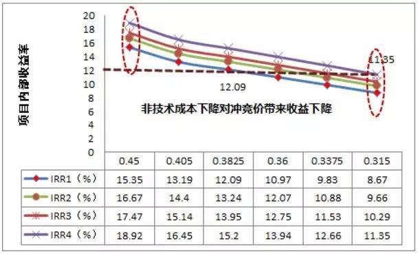不同情景假設(shè)下項(xiàng)目?jī)?nèi)部收益變化,非技術(shù)成本下降對(duì)沖競(jìng)價(jià)帶來(lái)效益下降