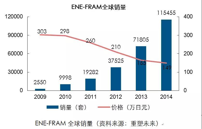在銷量方面,2014年ENE-FARM全球銷量11萬套,售價149萬日元(大約8.7萬人民幣)。2017年5月,ENE-FARM全球銷量突破20萬套。對此,日本政府提出在2030年之前實現(xiàn)約相當(dāng)于日本一成家庭的530萬套的銷售目標(biāo)。
