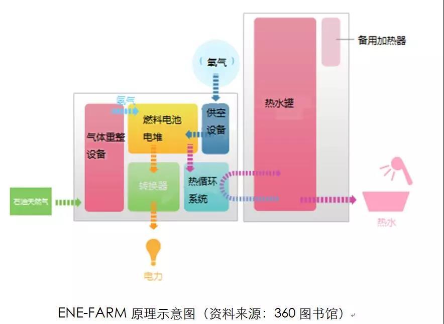 日本家用熱電聯(lián)產(chǎn)系統(tǒng)ENE-FARM是一種燃料電池在家庭中高效利用的能源系統(tǒng)。它通用天然氣重整制取氫氣,再將氫氣注入燃料電池中發(fā)電,同時用發(fā)電時產(chǎn)生的熱能來供應(yīng)暖氣和熱水,整體能源效率可達90%。