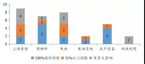 從交易事件數(shù)量看,上游資源、電池、原材料和生產(chǎn)設(shè)備領(lǐng)域的交易事件較多,分別為9件、8件、7件和5件。深入到交易后達成的控制程度看,生產(chǎn)設(shè)備和原材料領(lǐng)域獲得“100%絕對控制權(quán)”的比例較高,分別為80%和71%;獲得“51%以上控制權(quán)”比例較高的領(lǐng)域有生產(chǎn)設(shè)備、電池系統(tǒng)、原材料和上游資源4個領(lǐng)域,其中生產(chǎn)設(shè)備和電池系統(tǒng)領(lǐng)域的所有并購在交易后均達到了對被并購公司的控制,原材料和上游資源領(lǐng)域有一半以上的并購在交易后達到了對被并購公司的控制?;厥疹I(lǐng)域并購后均對被并購單位產(chǎn)生重大影響。