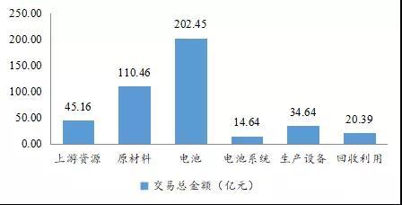 從交易金額看,6個細分領(lǐng)域共涉及交易金額427.74億元(1美元按6.6元人民幣折算,不包含金額不確定的并購事件),電池及上游原材料、上游資源領(lǐng)域的交易金額較高,電池研發(fā)生產(chǎn)之后的電池系統(tǒng)、生產(chǎn)設(shè)備、回收利用領(lǐng)域的交易金額較低,其中電池領(lǐng)域的交易金額最大,為202.45億元,占總交易金額的47.33%。